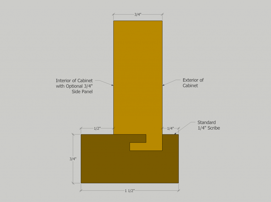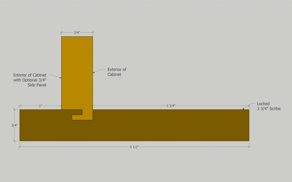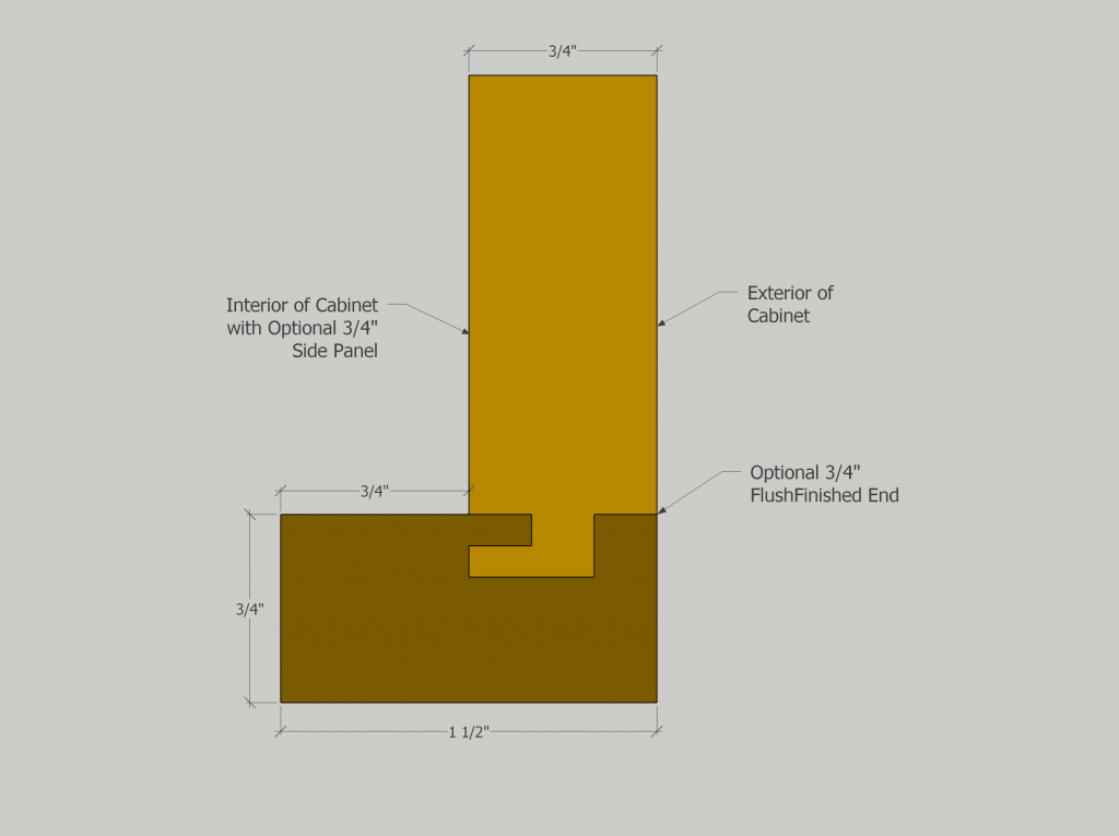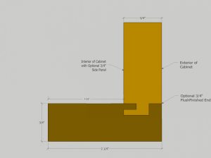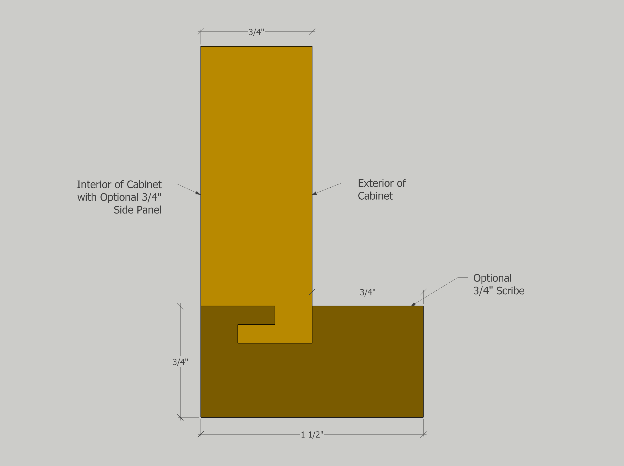 When a cabinet side is not “Finished” typically Cabinotch will default the thickness of that side panel to a ½” plywood component. You may choose to override this by selecting for “3/4in” side. NOTE, this does not effect “scribe” as it is measured from outside frame edge to outside of this side.