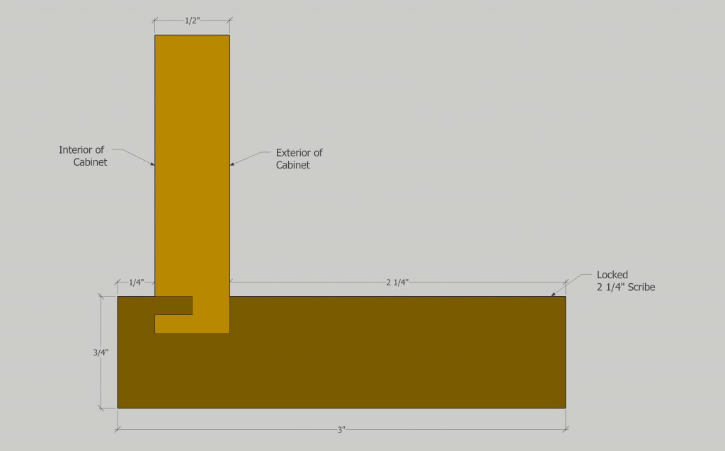 For example, a 30" cabinet with a 3" stile (2 1/4" Outside scribe) will finish at 30".