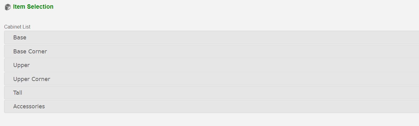 After defining a set of preset options or selecting from a previously generated preset you will then populate cabinets into you project one at a time. The next screen you come to will be the Item Selection screen where you will be presented with our current catalog. By selecting from the Cabinet List, you will find a multitude of categories which are expandable, under each category you will find cabinets in various configurations.